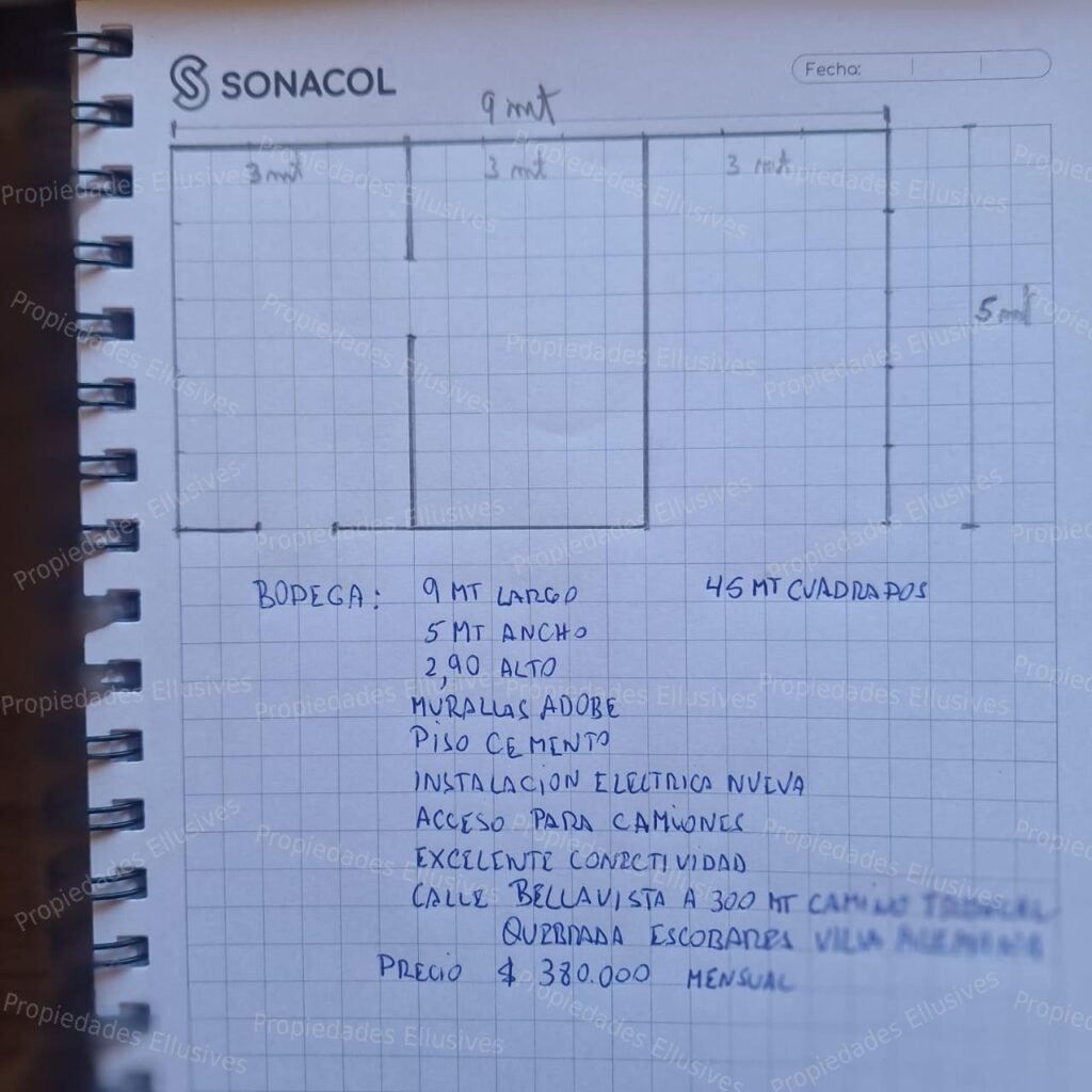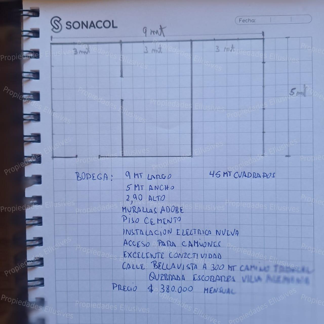 Se arrienda exclusivo conjunto de tres bodegas de 15 m² cada una, sumando una superficie total de 45 m². Ubicadas estratégicamente en Calle Bellavista, Quebrada Escobares, a solo 300 metros del Camino Troncal.